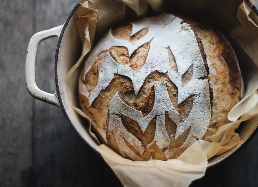 - Slide the loaf into your hot dutch oven and put the lid on. Place it back in the oven and reduce the temperature to 220c/430F. Bake for 35 minutes with the lid on. Remove the loaf from the dutch oven and bake for another 12 minutes or until the crust is brown.