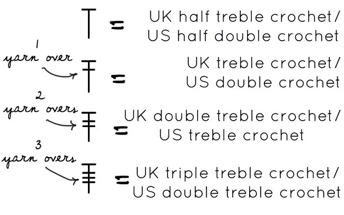 One of the great things about crochet symbols is that they look like how you would make that stitch. For example, the horizontal bars in stitches relate to the number of yarn overs at the beginning of that stitch (except for half treble/double stitches).