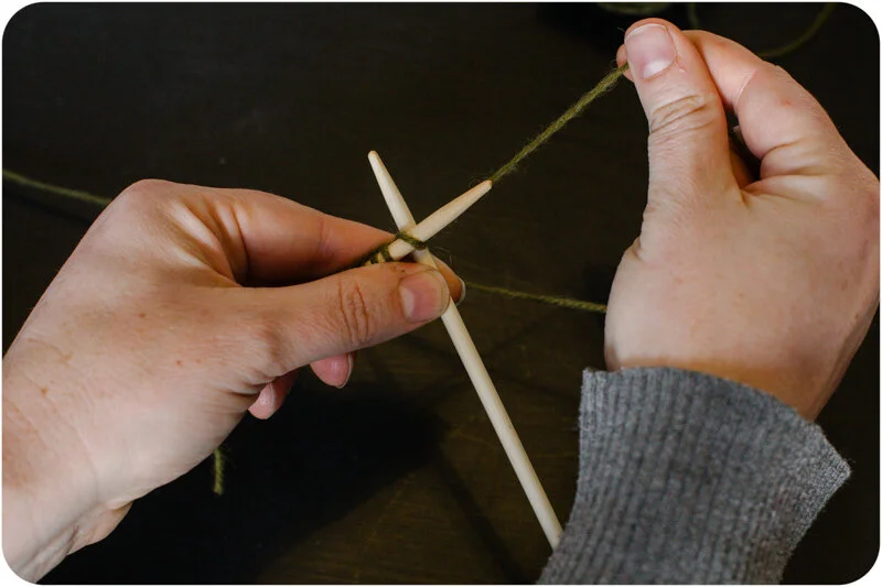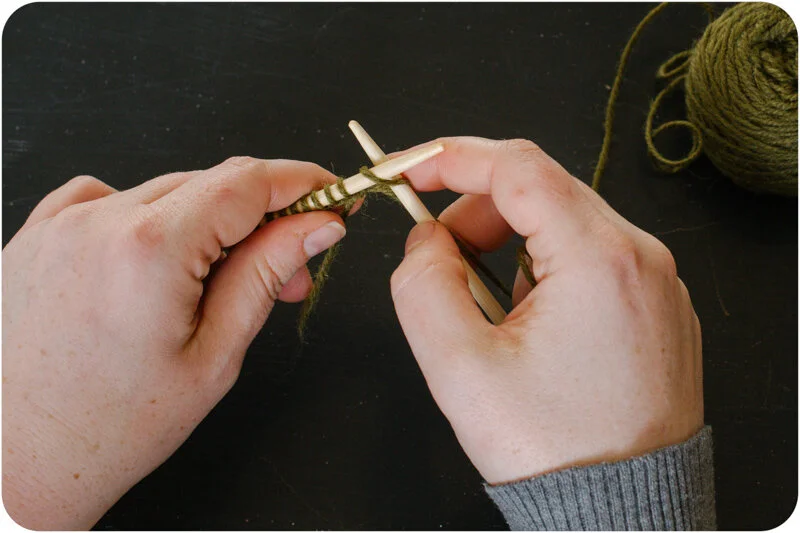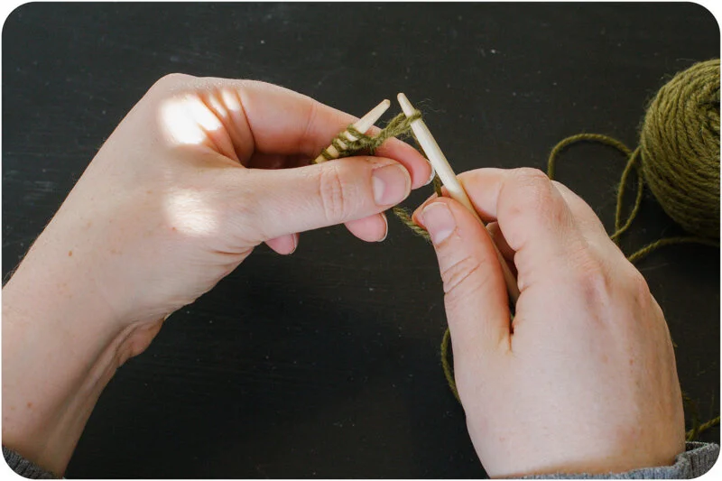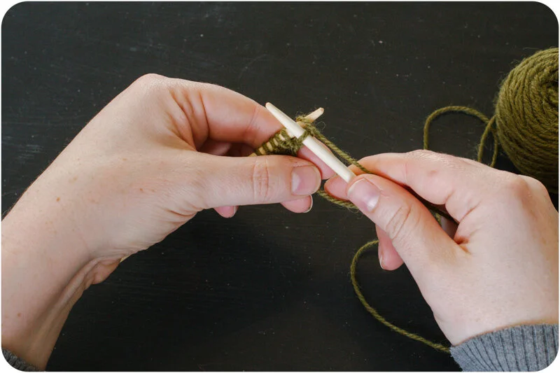 2. Bring your yarn under, around then over the top of the right hand needle. Initially, it may be easiest to hold both of the needles in your left hand and bring the yarn around with your whole hand. With time, may knitters can use just one finger to bring the yarn around the needle.