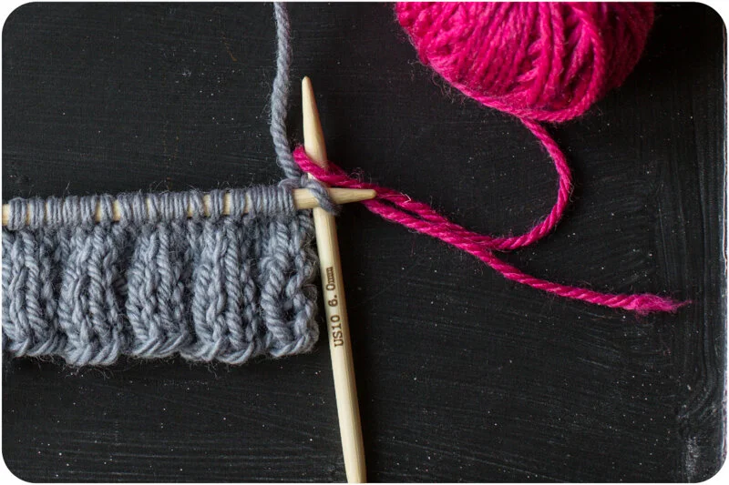 When its time to change colours, drop the first colour and, leaving a long tail, knit a stitch with the new colour.