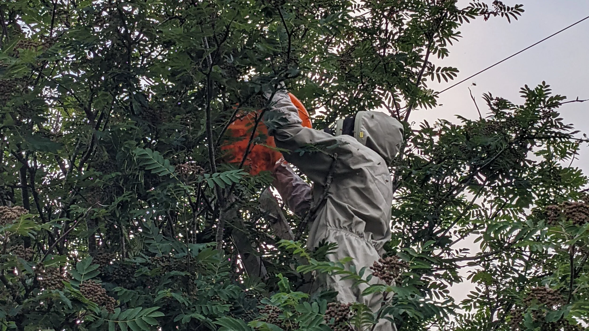 And so we loaded up and drove over. The swarm sat in the top of a Rowan tree on one of the main streets. As the street watched, we collected the swarm - Stevie and Ellis climbing the ladder while I ran ground control. Bees clouded around us and where I could've panicked, I knew that staying calm was the only way that it was going to work. Once the hive was collected with the queen safely inside, I drove home with a few thousand bees buzzing in my back seat.