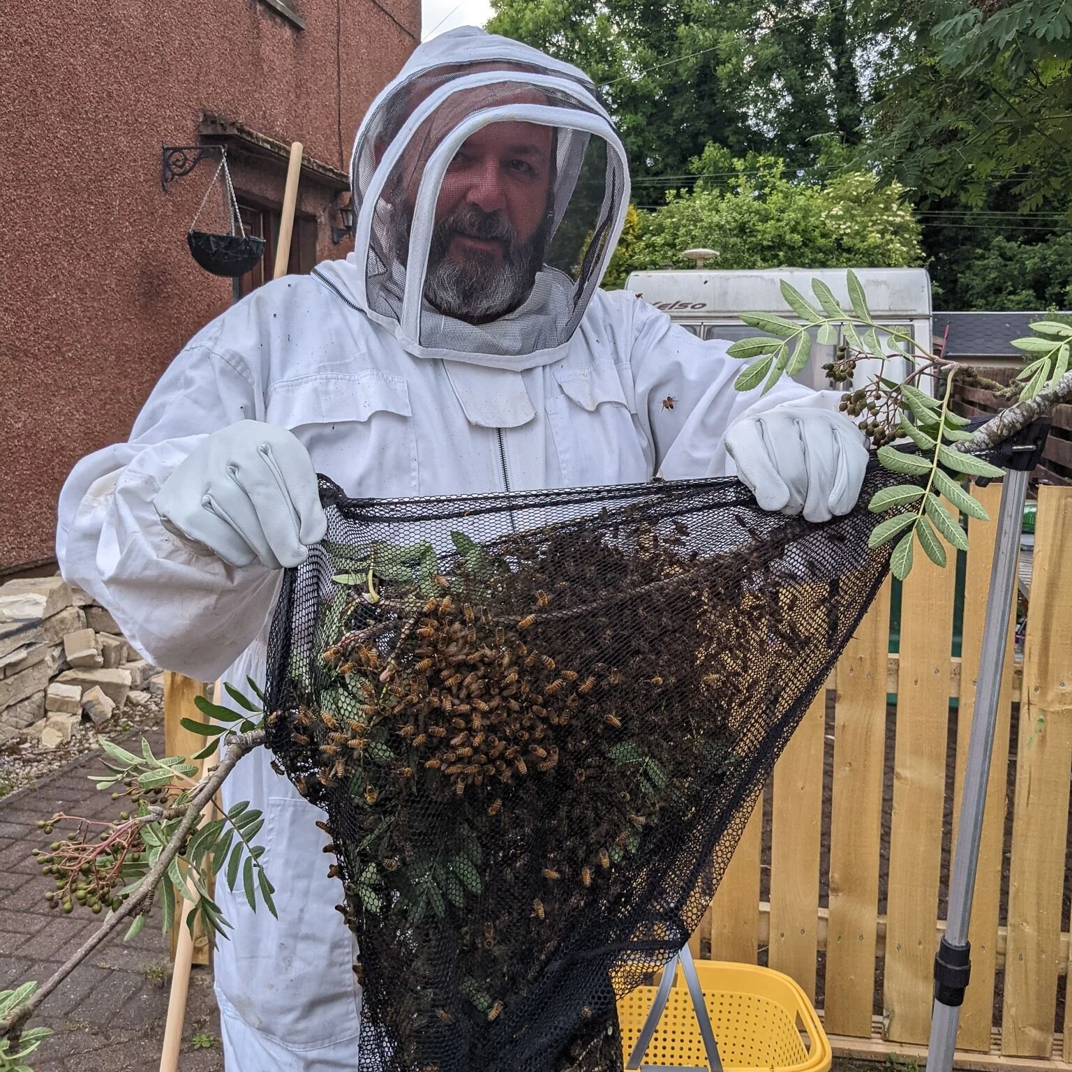 Less than a week later though, I was tagged in a Facebook post by a friend that a swarm needed collecting in the neighbouring village. Jim the Bee Master was off to shear sheep and I needed to go and collect it. Its all well and good saying that I was taking a break from the bees, but there isn't a day off if there is an emergency.